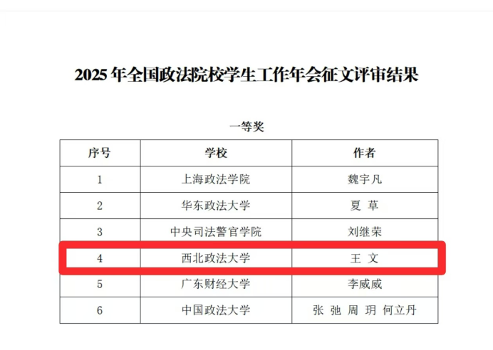 11月19日至21日,2025年全国政法院校学生工作年会在华东政法大学举行,我院辅导员王文老师撰写的论文《学生申诉处理委员会制度探析》荣获一等奖。