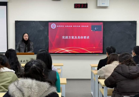 来沅晖对本次实训实施方案作详细解读。她要求同学们严格遵守实习单位与学校的考勤、请假制度,恪守诚信原则,坚决杜绝实训造假行为;同时明确了实习日志、实训鉴定表、实务证明、实训报告等材料的提交规范与要求。