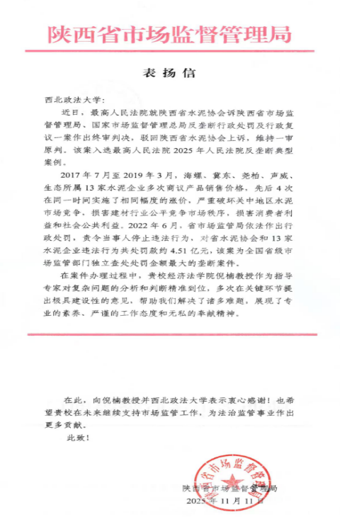 11月11日,陕西省市场监督管理局对经济法学院(知识产权学院)院长倪楠教授发来表扬信,感谢他在这一全国省级市场监管部门独立查处处罚金额最大的反垄断案件中表现出的专业素养、严谨的工作态度以及无私的奉献精神。信中提到,倪楠作为案件指导专家对复杂问题的分析和判断精准到位,多次在关键环节提出极具建设性的意见。
