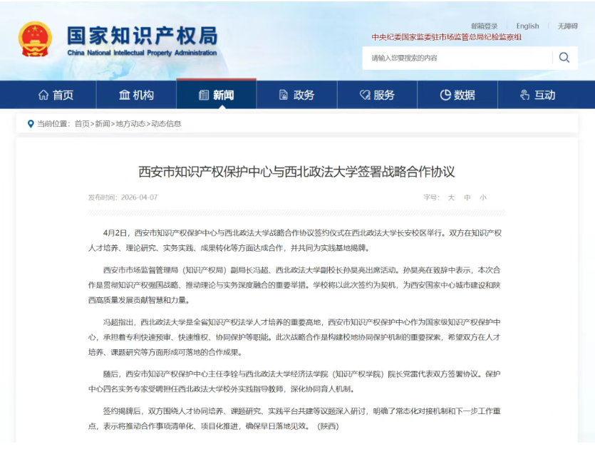 4月2日,西安市知识产权保护中心与西北政法大学战略合作协议签约仪式在西北政法大学长安校区举行。双方在知识产权人才培养、理论研究、实务实践、成果转化等方面达成合作,并共同为实践基地揭牌。